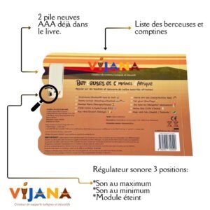 “Berceuses et Comptines d’Afrique” est un livre sonore interactif pour les enfants de 1  an et plus avec 10 chansons africaines mettant en vedette la culture de différents pays.